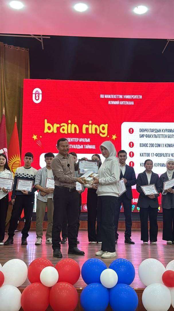 Ош мамлекеттик университетинин факультеттеринин арасында өткөрүлгөн «Брейн ринг» интеллектуалдык таймашында Индустриалдык-педагогикалык колледжинин КТБ9-2-25 тайпасынын студенттери жана куратору Сайдрахимов Кудратилло Файзуллаевич ийгиликтүү катышып, байгелүү 2-орунду ээлешти.