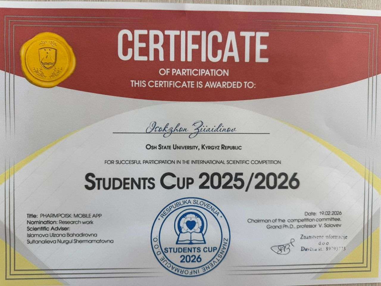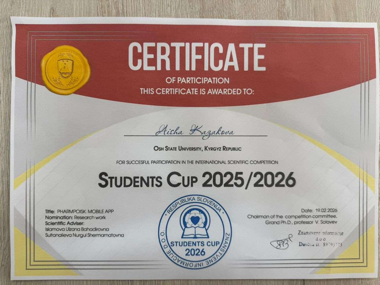 Студенты 1 курса по направлению “Управление бизнесом ” и студенты 3 курса по направлению “Менеджмент” учавствовали в международном конкурсе научных работ «Students Cup 2025/2026»с проектом PHARMPOISK: MOBILE APP,Организатор — Международный образовательный центр«ZNANSTVENEINFORMACIJE D.O.O.», Любляна, Словения.Научные руководители преподаватели кафедры “Менеджмент и маркетинг” Исламова У.Б., Султаналиева Н.Ш.