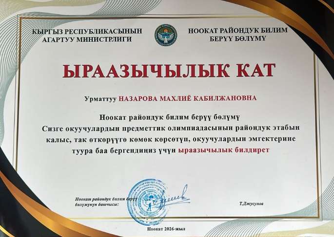 Преподаватели кафедры фонетики и грамматики английского языка Назарова М.К. и Ташболот кызы А. 11–12 февраля 2026 года приняли участие в районной олимпиаде по английскому языку в г. Ноокат в качестве комиссии и были удостоены благодарственных писем за вклад в её организацию и проведение.