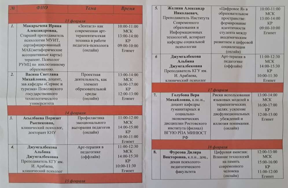 Иш-чаранын алкагында Кыргызстандын башка жогорку окуу жайларынан келген окутуучулар менен биргеликте заманбап билим берүү технологияларын колдонуу, педагогикалык процесске психологиялык ыкмаларды интеграциялоо жана инновациялык окутуу методдорун өркүндөтүү багыттарында тажрыйба алмашуу жүргүзүлдү.