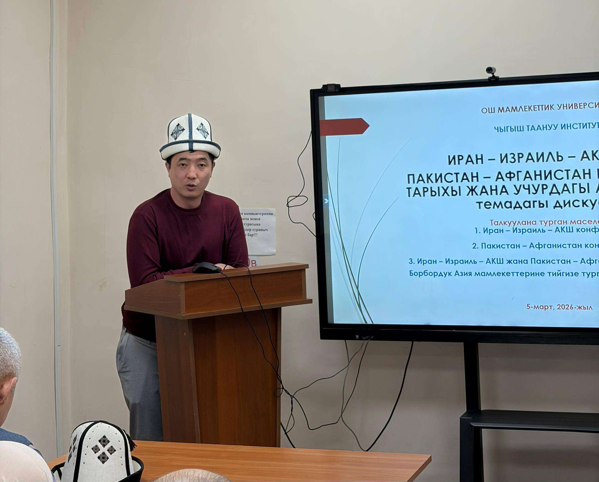 Дискуссиянын темасы: "Иран - Израиль - АКШ жана Пакистан - Афганистан конфликттери: тарыхы жана учурдагы абалы" - деп аталып дискуссиянын башталышында Б.Сыдыков атындагы Кыргыз-Өзбек Эл аралык университетинин окутуучусу, тарыхчы, саясий серепчи Азамат Бакиров жана ОшМУнун Чыгыш таануу институтунун директору, тарых илимдеринин кандидаты, доцент Жолдошбек Бөтөнөев дискуссиянын темасына байланыштуу презентацияларды жасашты.