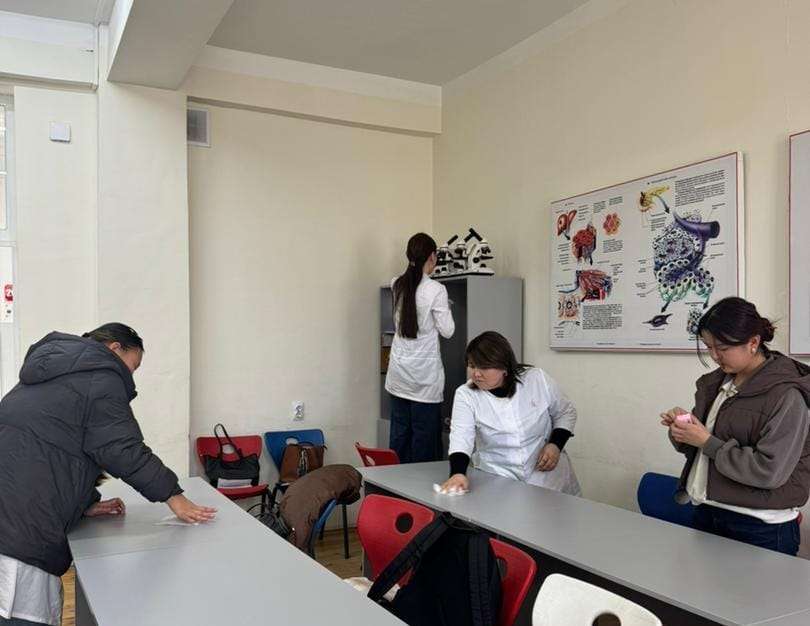 Ош шаарынын мэриясынын 2026-жылдын №217 токтомуна ылайык «Жазгы үч айлыкты жарыялоо, Ош шаарын жашылдандыруу, көрктөндүрүү жана санитардык тазалоо» иш-чарасынын алкагында Медицина факультетинин Морфологиялык дисциплиналар кафедрасында ишембилик өткөрүлдү.