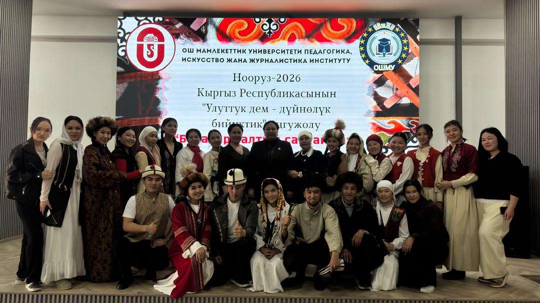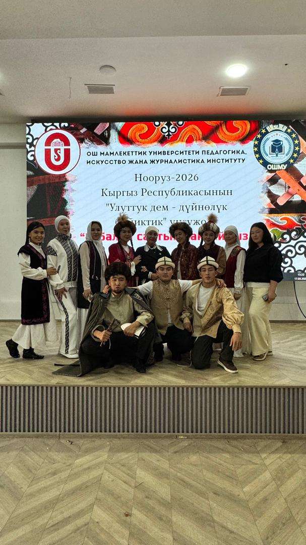 Бүгүн, 17-мартта ОшМУнун Педагогика, искусство жана журналистика институтунда “УЛУТТУК ДЕМ – ДҮЙНӨЛҮК БИЙИКТИК” уңгужолун ишке ашыруу максатында жана Нооруз майрамына карата уюштурулган “Бабалар салтын сактайбыз” аттуу студенттик тайпалар арасындагы кыргыз элинин каада-салттары боюнча театралдык коюмдар жана монологдор конкурсу жыйынтыкталды.