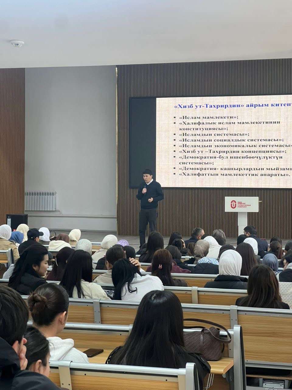 Жолугушууда студенттерге диний чөйрөдөгү мамлекеттик саясат, радикализм, экстремизм жана терроризм түшүнүктөрү тууралуу маалымат берилип, мындай терс көрүнүштөрдөн алыс болуунун мааниси түшүндүрүлдү.
