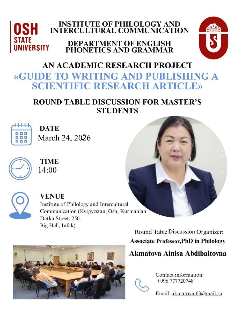 24 марта 2026 года доцент кафедры фонетики и грамматики английского языка, PhD по Филологии Акматова Айниса Абдибаитовна провела круглый стол для магистрантов на тему «Руководство по написанию и публикации научной статьи». Мероприятие было организовано в рамках дисциплины «Академический исследовательский проект» и посвящено предстоящей научно-практической конференции Института филологии и межкультурной коммуникации Ошского государственного университета.