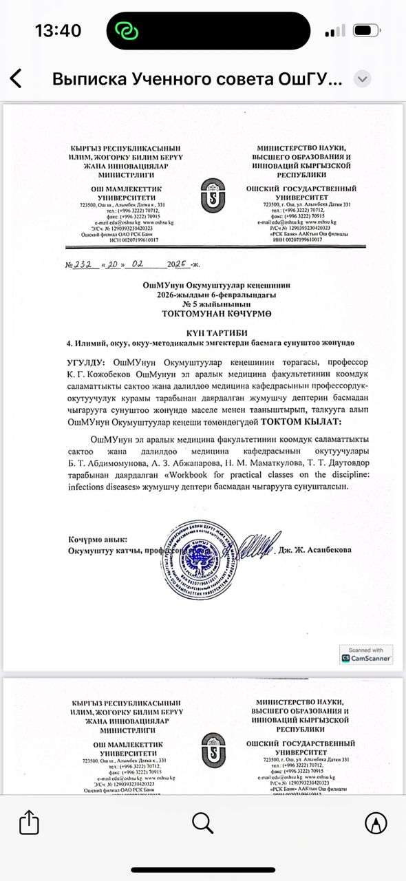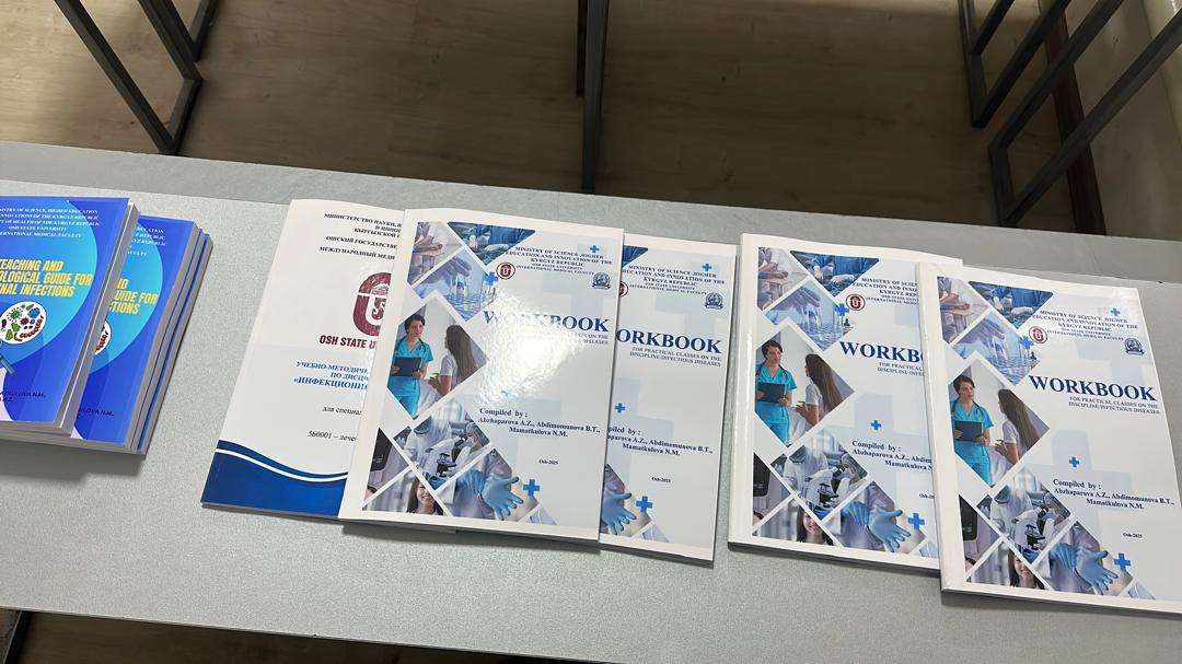Учебно-методическое пособие «Teaching and Methodological Guide for Intestinal Infections» и «Workbook for Practical Classes on the Discipline Infectious Diseases», авторами которого являются к.м.н. Абдимомунова Б.Т., PhD Маматкулова Н.М., Абжапарова А.З. и Даутов Т.Т., заняло первое место в конкурсе на уровне факультета среди всех кафедр. Данное пособие предназначено для студентов медицинских факультетов и сочетает в себе теоретические материалы и практические задания, что обеспечивает глубокое понимание инфекционных заболеваний кишечника. Оно стало ценным инструментом для преподавателей и студентов, повышая эффективность учебного процесса и поддерживая высокий уровень подготовки будущих специалистов. Теперь авторы будут представлять своё пособие в конкурсе среди факультетов ОшГУ, который пройдёт с 13 апреля 2025 года по 23 апреля 2026 года. Это ещё одна возможность продемонстрировать высокий уровень подготовки и инновационный подход к обучению студентов медицинского факультета.
