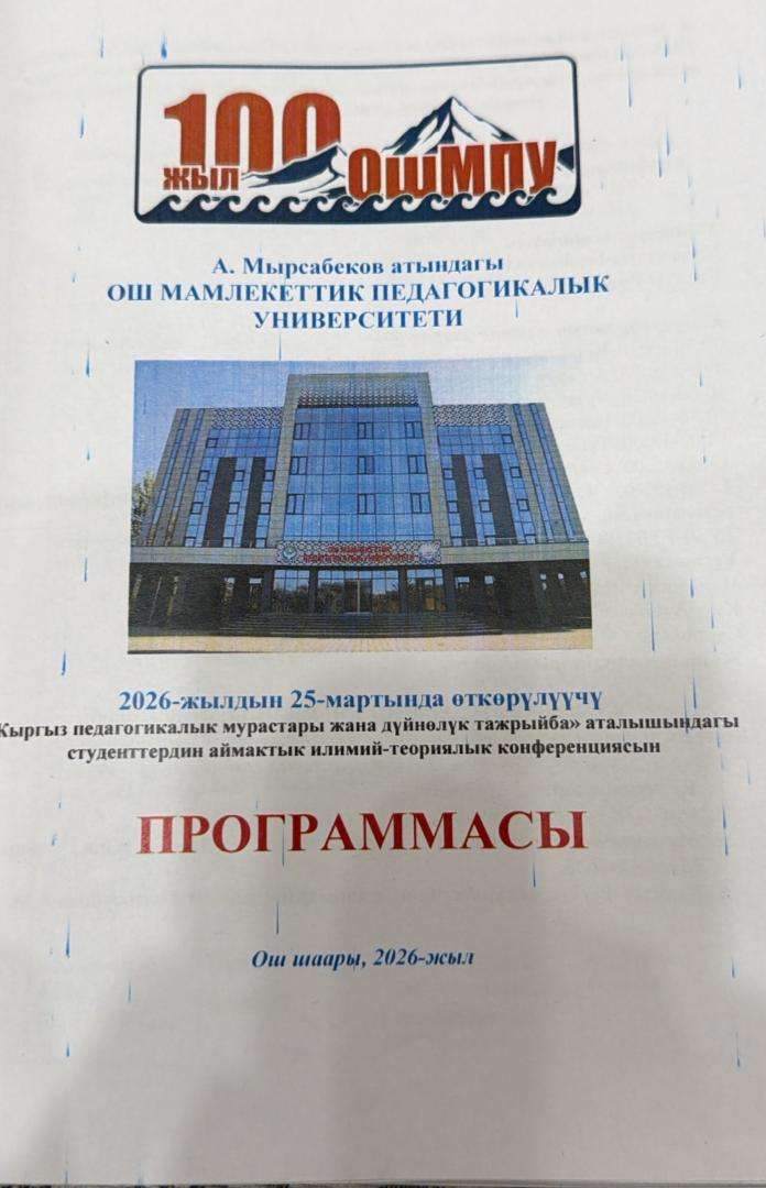 25 марта 2026 года в Ошском государственном педагогическом университете имени А. Мырсабекова состоялась региональная научно-теоретическая конференция студентов на тему «Кыргызское педагогическое наследие и мировой опыт». В данной конференции приняла участие студентка группы УКР-7-25 Финансово-юридического колледжа Ошского государственного университета (ОшГУ) Тажибаева Акбийке. Подготовка участницы осуществлялась под руководством преподавателя ПЦК общественных наук и допризывной подготовки Анарбаевой Д. М.