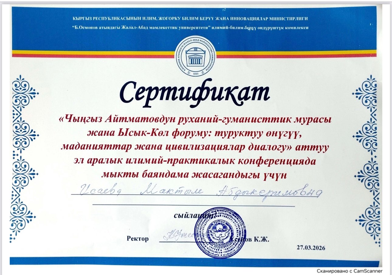 СГД кафедрасынын доценти, ф.и.к. М.А.Исаева 2026-жылдын 27-мартында Манас шаарында өткөрүлгөн «Ч.Айтматовдун руханий-гуманисттик мурасы жана Ысык-Көл форуму: улуттук дем – дүйнөлүк бийиктик уңгу жолу туруктуу өнүгүүнүн, маданияттар жана цивилизациялардын диалогу» аттуу эл аралык илимий-практикалык конференцияга катышып «Кыргыз тилин чет тил катары окутуудагы тилдик маданият таануу маселеси» деген темада доклад окуду. Каралган маселенин теориялык жана практикалык актуалдуулугу жогору бааланды.