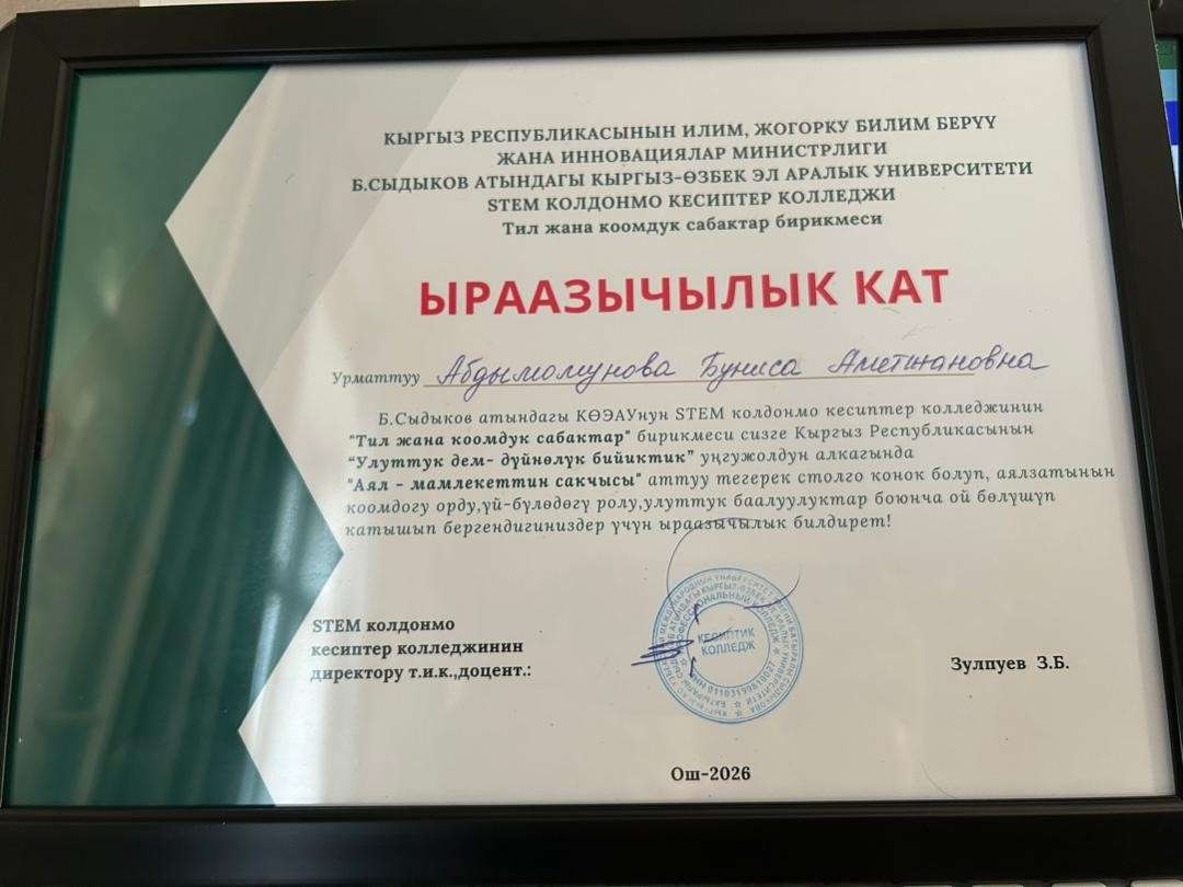 Эл аралык Б. Сыдыков атындагы Кыргыз-Өзбек Эл аралык университетинин (КӨЭАУ) STEM колдонмо кесиптер колледжинин чакыруусу менен маанилүү иш-чара болуп өттү. Кыргыз Республикасынын “Улуттук дем-дүйнөлүк бийиктик” унгужолунун алкагында уюштурулган “Аял — мекендин сакчысы” аттуу тегерек столго Ош мамлекеттик университетинин STEM инновациялык колледжинин окутуучулары конок катары катышып келишти.