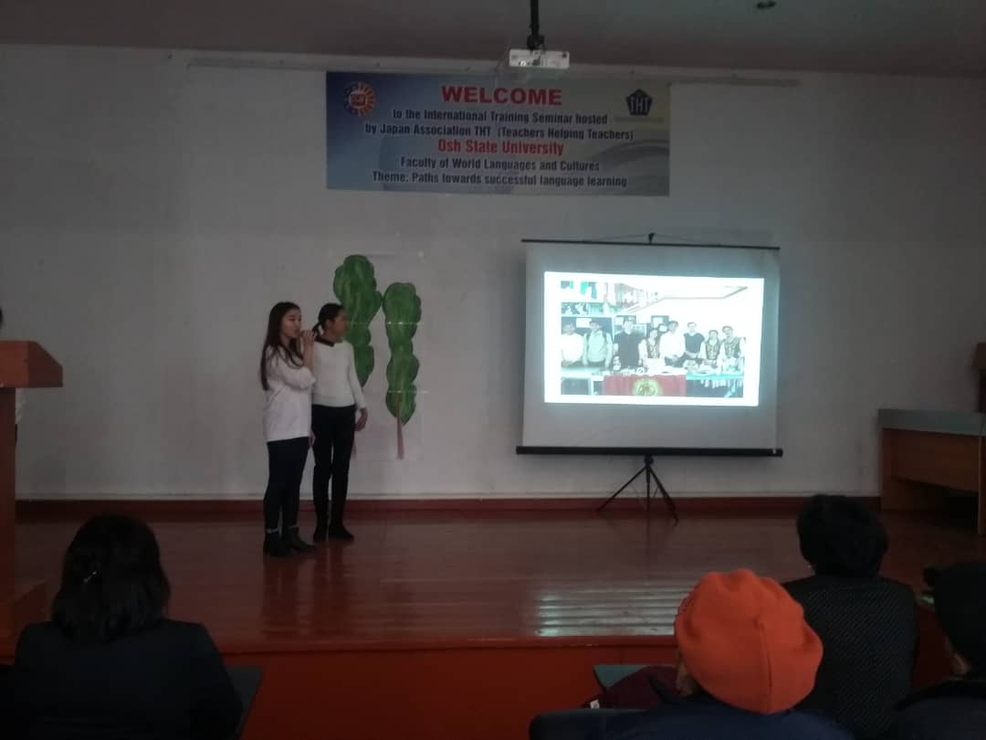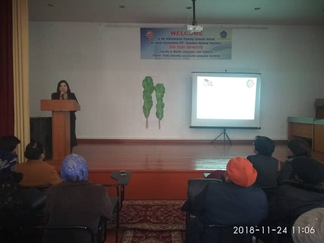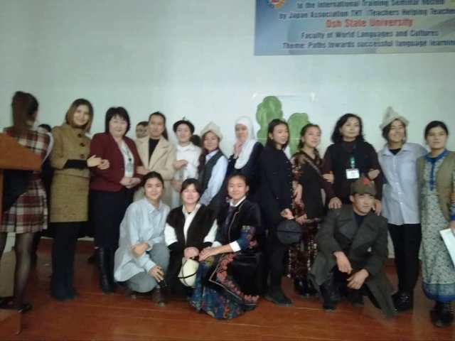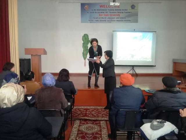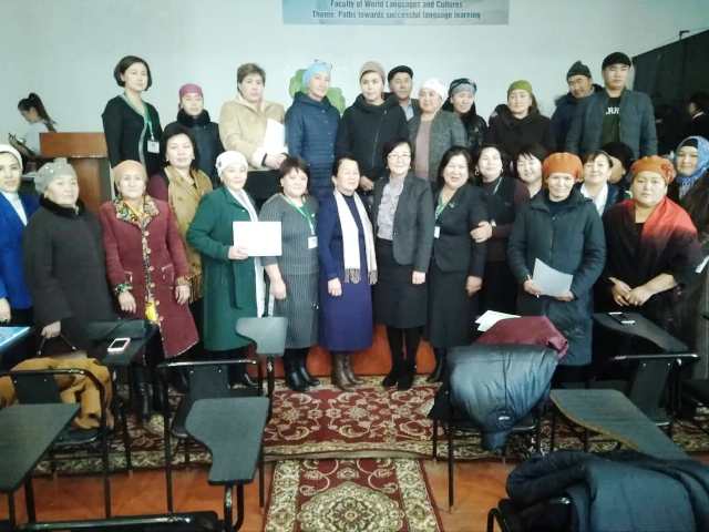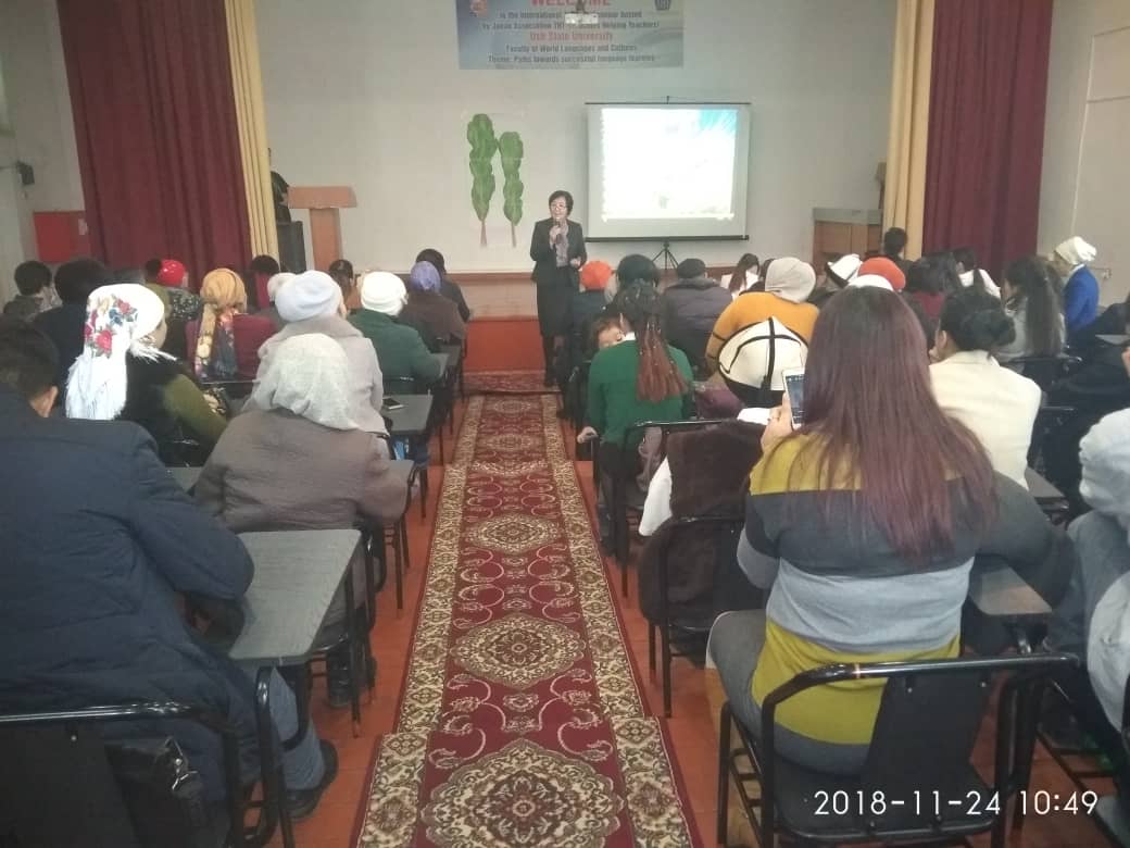 November 24, 2018 the teaching staff of the chair of English Phonetics and Grammar organized a parental meeting together with the 3rd year students. The meeting was held to present the parents(as stakeholders) the mission of OshSU. The faculty of world languages and cultures, the purposes and learning outcomes of the main program on “philological education”. The dean of the FWLC docent S.Kalygulova delivered an opening speech when she gave general information about the teaching system at the faculty, mobility of students, the future perspectives. The chairperson, docent A.Akmatova presented, the mission of OshSU, program purposes, learning outcomes of teaching process in detailed form. The meeting gave a good opportunity to parents to express their viewpoints about teaching process, the outcomes of it and thanked the staff for teaching their children. The active and smart students’ parents were awarded with the Gratitude Papers, at the end the talented students performed an extract from Ch.Aitmatov’s novel “First teacher” in English, sang songs and danced.