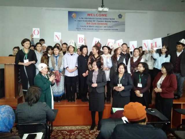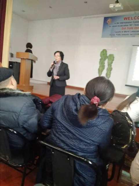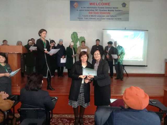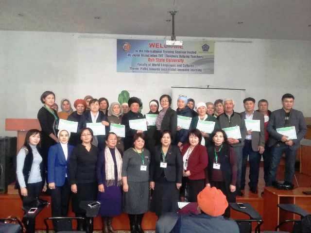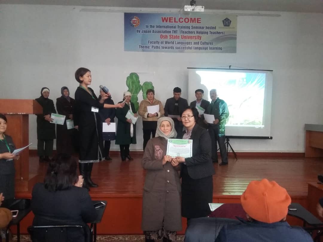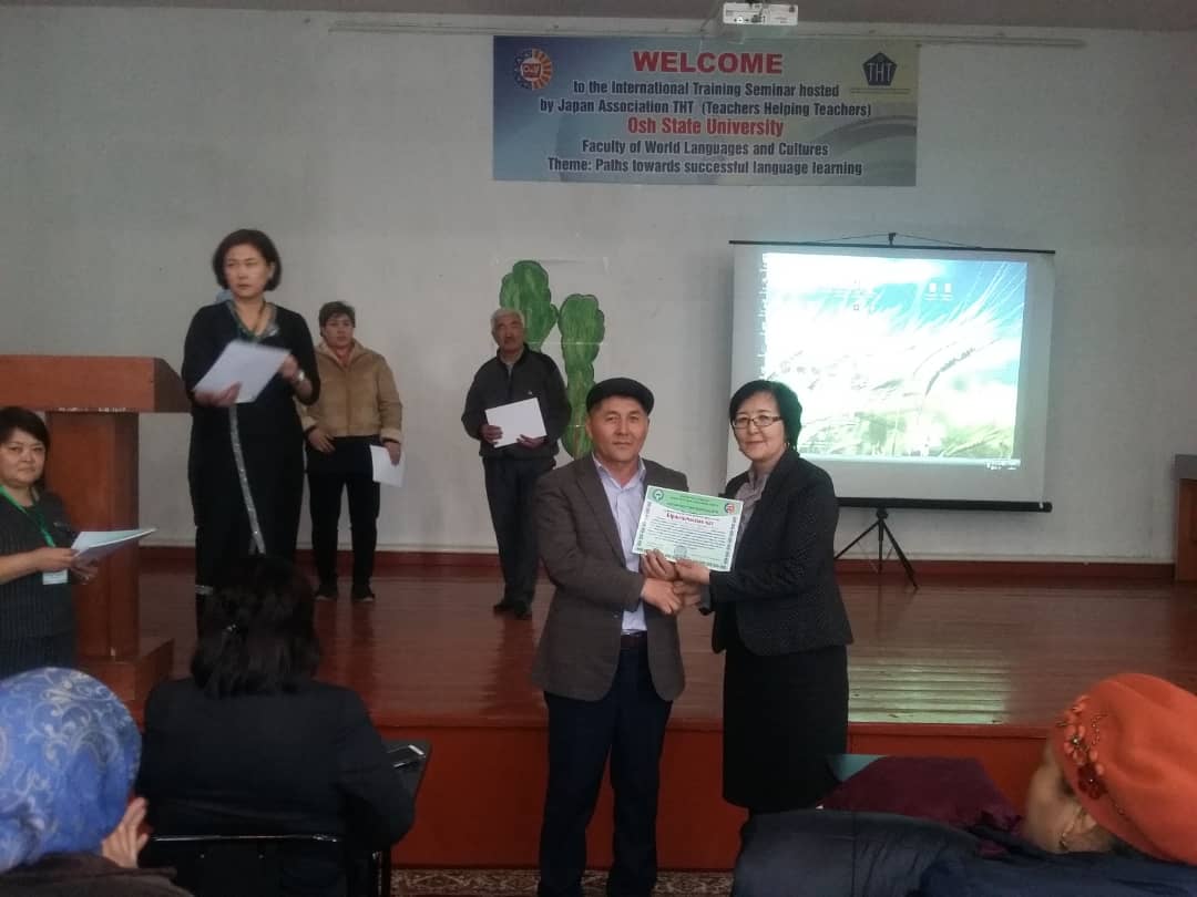 November 24, 2018 the teaching staff of the chair of English Phonetics and Grammar organized a parental meeting together with the 3rd year students. The meeting was held to present the parents(as stakeholders) the mission of OshSU. The faculty of world languages and cultures, the purposes and learning outcomes of the main program on “philological education”. The dean of the FWLC docent S.Kalygulova delivered an opening speech when she gave general information about the teaching system at the faculty, mobility of students, the future perspectives. The chairperson, docent A.Akmatova presented, the mission of OshSU, program purposes, learning outcomes of teaching process in detailed form. The meeting gave a good opportunity to parents to express their viewpoints about teaching process, the outcomes of it and thanked the staff for teaching their children. The active and smart students’ parents were awarded with the Gratitude Papers, at the end the talented students performed an extract from Ch.Aitmatov’s novel “First teacher” in English, sang songs and danced.