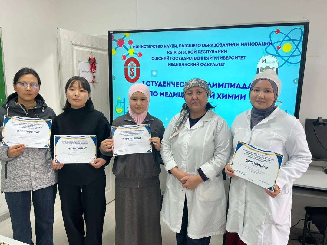 2025-жылдын 10-декабрында Өзбекстан Республикасынын Ташкент медициналык институтунда «Биофизика» дисциплина боюнча эл аралык студенттик олимпиадага ОшМУнун медицина факультетинин "Табигый илимдер дисциплиналары" кафедрасынан ф.м.и.к., доцент М.М. Садырованын жана ф.м.и.к., доцент Б.А. Каденованын 4 студенти катышып, алардын Эргешбаев Адилет (Ст-1, тайпасы) жана Рахимова Нафисабону (Лк-28, тайпасы) сертификат менен сыйланышты.