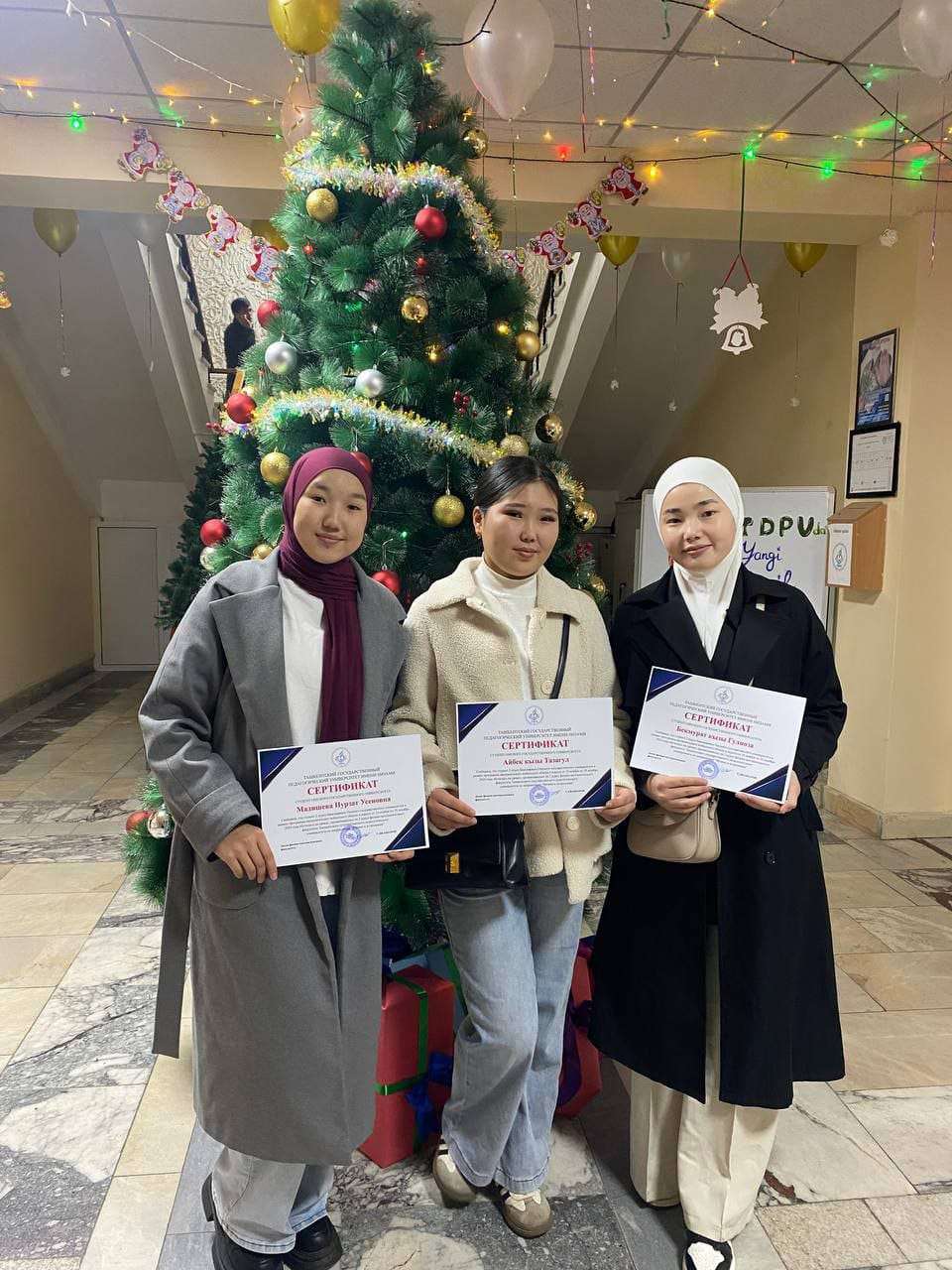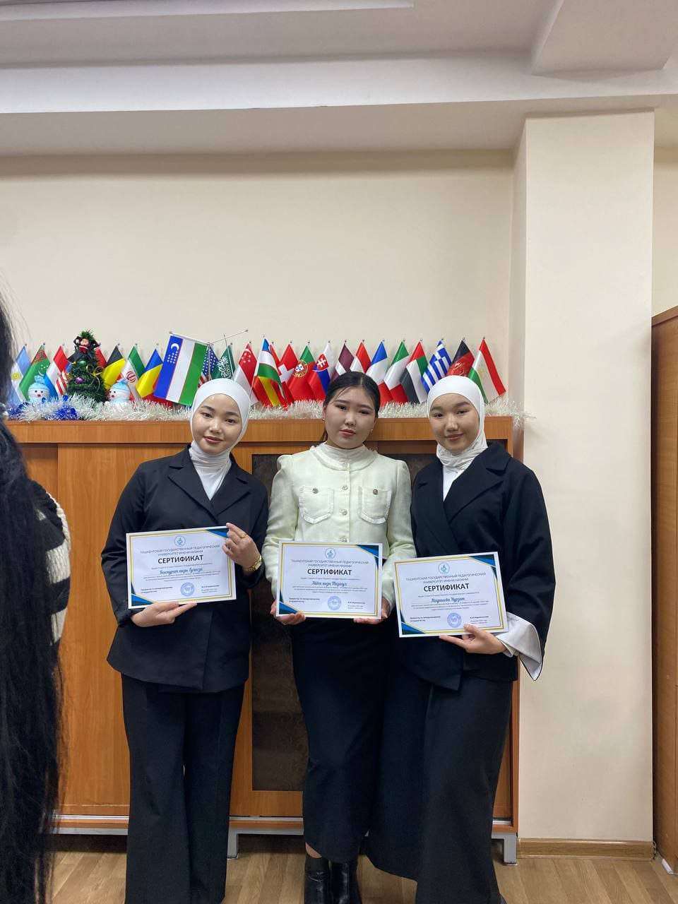 2024-2025-окуу жылынын 18-ноябрынан 21-декабрына чейин Жалпы физика жана ФОУ кафедрасынын ФЕ(б)-1-23 тайпасынын студенттери: Бекмурат кызы Гүлноза, Мадишева Нурзат, Айбек кызы Тазагүл Ташкент мамлекеттик университетине 1 айлык окуу мөөнөтүнө барып келишти.