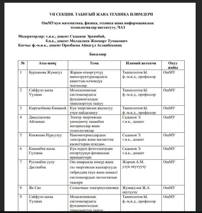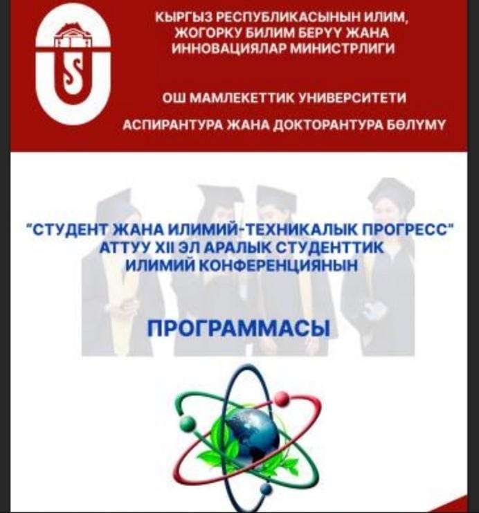 2025- жылдын 29- ноябрында ОшМУда " Студент жана илимий техникалык прогресс " аттуу XII эл аралык илимий конференция болуп өттү. Конференцияга ЭТФ кафедрасындагы 510400 "Физика" адистигинин студенттери катышып баяндамаларды жасап, талкуудан өтүштү.