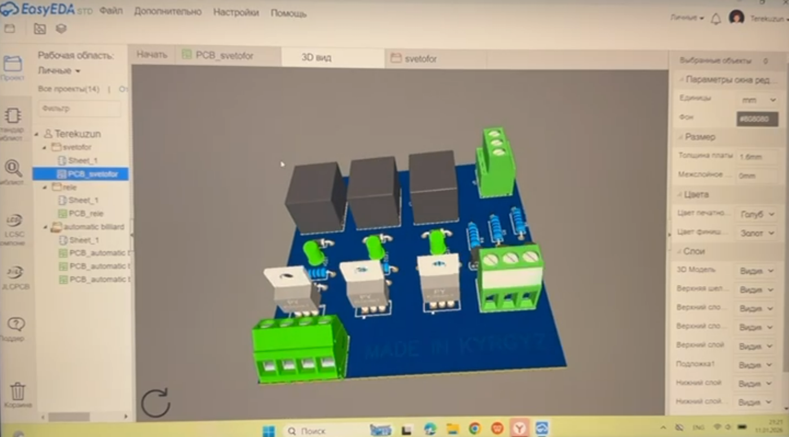 This project is aimed at developing the logic for automatic traffic light control using a PLC and modeling it as an electronic circuit in the EASY EDA software. The system ensures sequential operation of the lights via timers, allowing practical learning of automation fundamentals.
