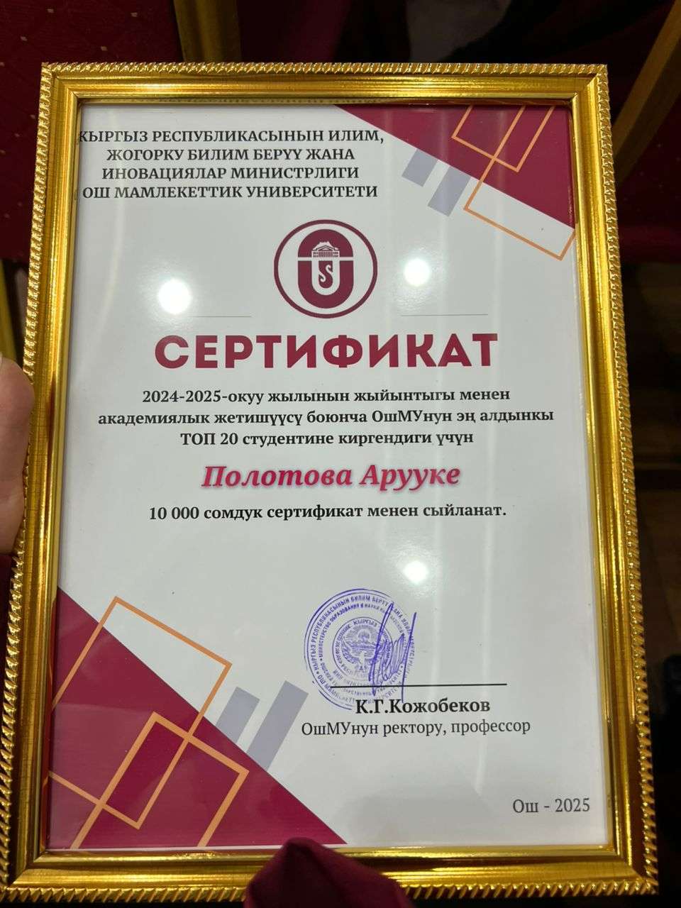 "ПИЭс 9-6-23 тайпасынын студенти Полотова Арууке Академиялык жетишүү боюнча алдыңкы топ 20 студентине кирди! Куттайбыз