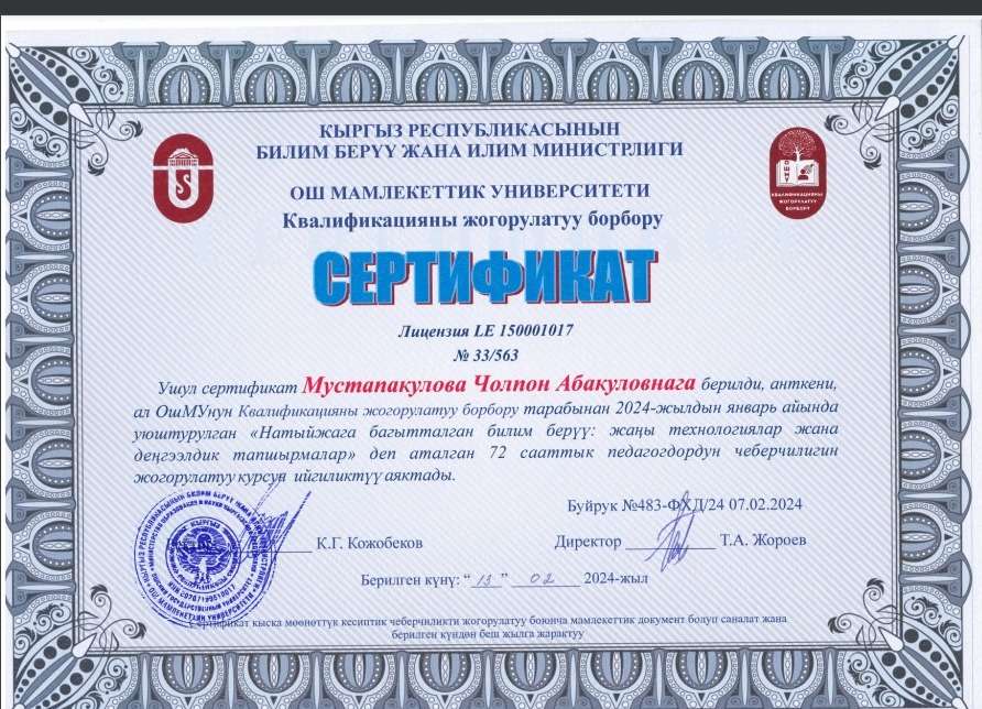 | 2 | Мустапакулова Ч.А. | Натыйжага багытталган билим берүү: жаңы технологиялар 72-саат | ОшМУ КЖБ | 2024 |
